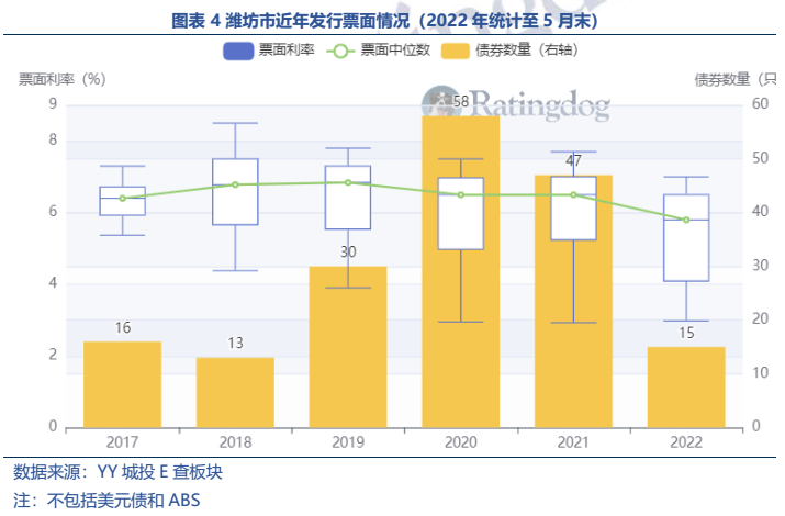 (2)從一級發(fā)行來看,濰坊整體融資成本偏高,2021年票面中位數(shù)6.5%,明顯高于同期全省票面中位數(shù)4.39%的水平。