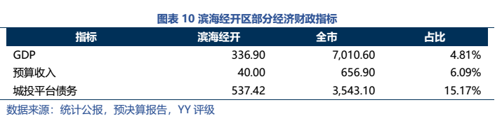 (2)濱海經(jīng)開區(qū)存在過度舉債的情況,21年區(qū)域YY Ratio為1,345%,債務負擔很重,但區(qū)域的發(fā)展?jié)摿Σ粡姡?0年獲批國家級開發(fā)區(qū),發(fā)展多年,城投平臺債務占全市的15.17%,預算收入占全市的6.09%;七普人口僅13.67萬人,22年5月房價4,800元/平方米)。