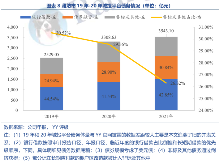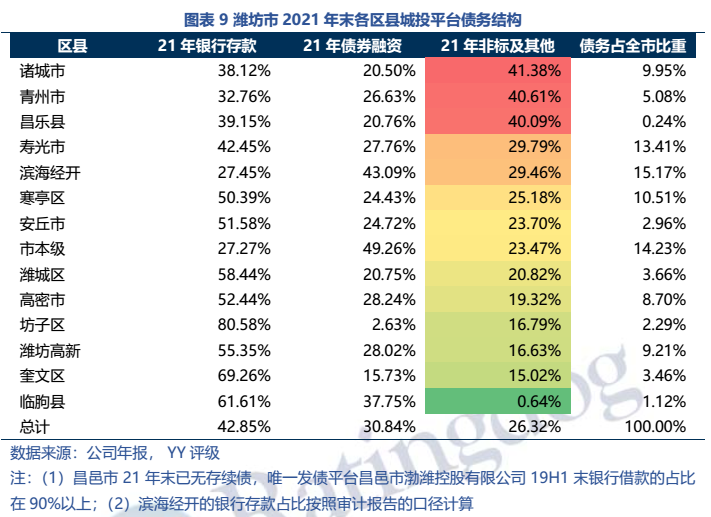 (1)區(qū)域金融資源并不弱(21年末金融機構存款余額1.12萬億元,省內(nèi)排名第三),但非標融資占比很高,21年末非標融資占26.32%,好在21年已經(jīng)有一定壓降。