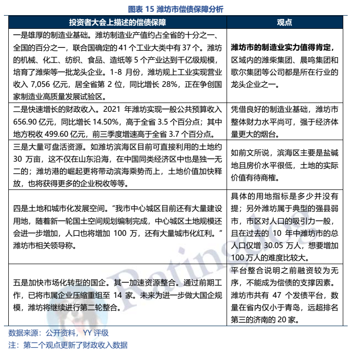 懇談會和信保基金并不能直接改變市場看法(如蘭州),具體還是要回歸到區(qū)域的支撐來看,投資者會上的對濱海經(jīng)開區(qū)土地的贊揚和中心城區(qū)城市化紅利的期盼暫且不論,但濰坊當?shù)刂圃鞓I(yè)水平依然值得肯定,整體財力水平尚可(省內(nèi)第三),但是在非標壓降、平臺整合和管控及資金運用效率上還需加強。