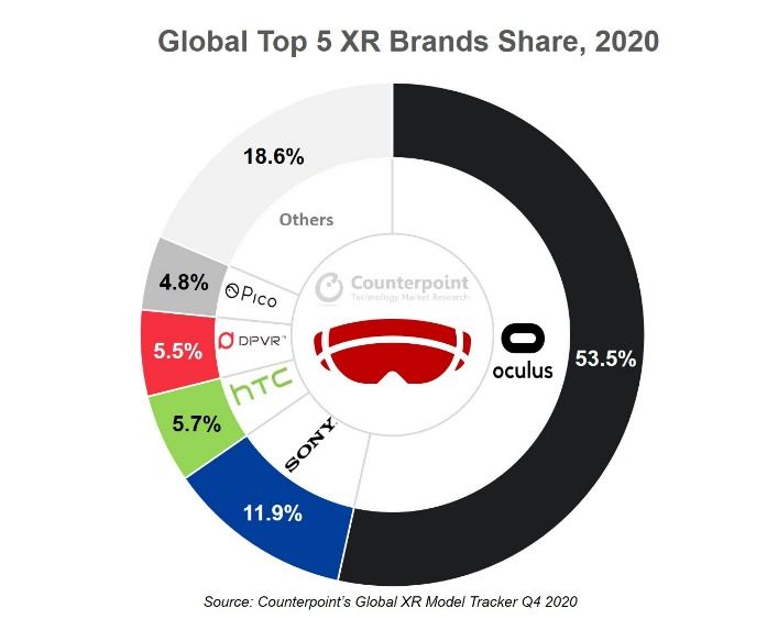 然而近年由于Oculus Quest 2受到市場追捧以及Pico等產品的崛起,導致HTC的虛擬現實設備市場份額相較于前期有所下滑。根據Counterpoint的數據顯示,2020年第四季度HTC在虛擬現實設備的市占率已經下滑到了5.7%。其市場份額被索尼和近幾年異軍突起Meta旗下的Oculus搶奪了過去。