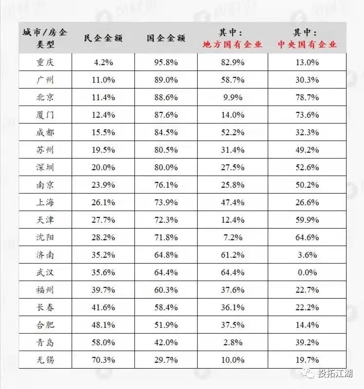 最近一段時(shí)間,很多城市都完成了第二批次的集中土地出讓,土拍的結(jié)果也都紛紛出爐了。有一組數(shù)據(jù),關(guān)于部分城市國(guó)企和民企拿地比例的統(tǒng)計(jì),非常有意思。