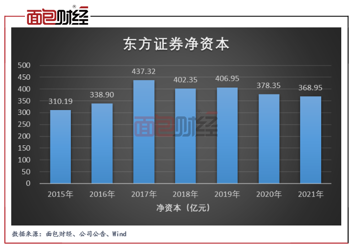 觀察數據可得,2015年至2017年,東方證券先后通過A股及H股首發上市,以及A股定增募資補充流動性,公司的凈資本規模在2017年年末達到上市以來最高值。隨后,在公司未再進行股權融資的4年間,公司的凈資本呈整體下滑趨勢。