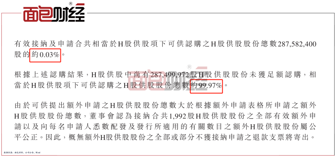 港股投資者參與供股者寥寥無幾,公司僅收到5份有效接納及申請。獲得有效認購的股數僅占H股供股總數的約0.03%。這意味著約99.97%的供股未獲認購。