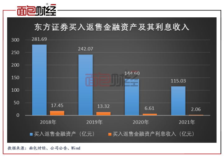 2018年以來,東方證券或出于控制信用風險的考量,持續縮減了買入返售金融資產的規模,從而導致買入返售金融資產利息收入逐年下降。但由該資產產生的減值損失卻未見明顯跌勢。2020年和2021年,買入返售金融資產分別產生減值損失36.96億元和13.18億元,均高于2018年和2019年發生的金額。