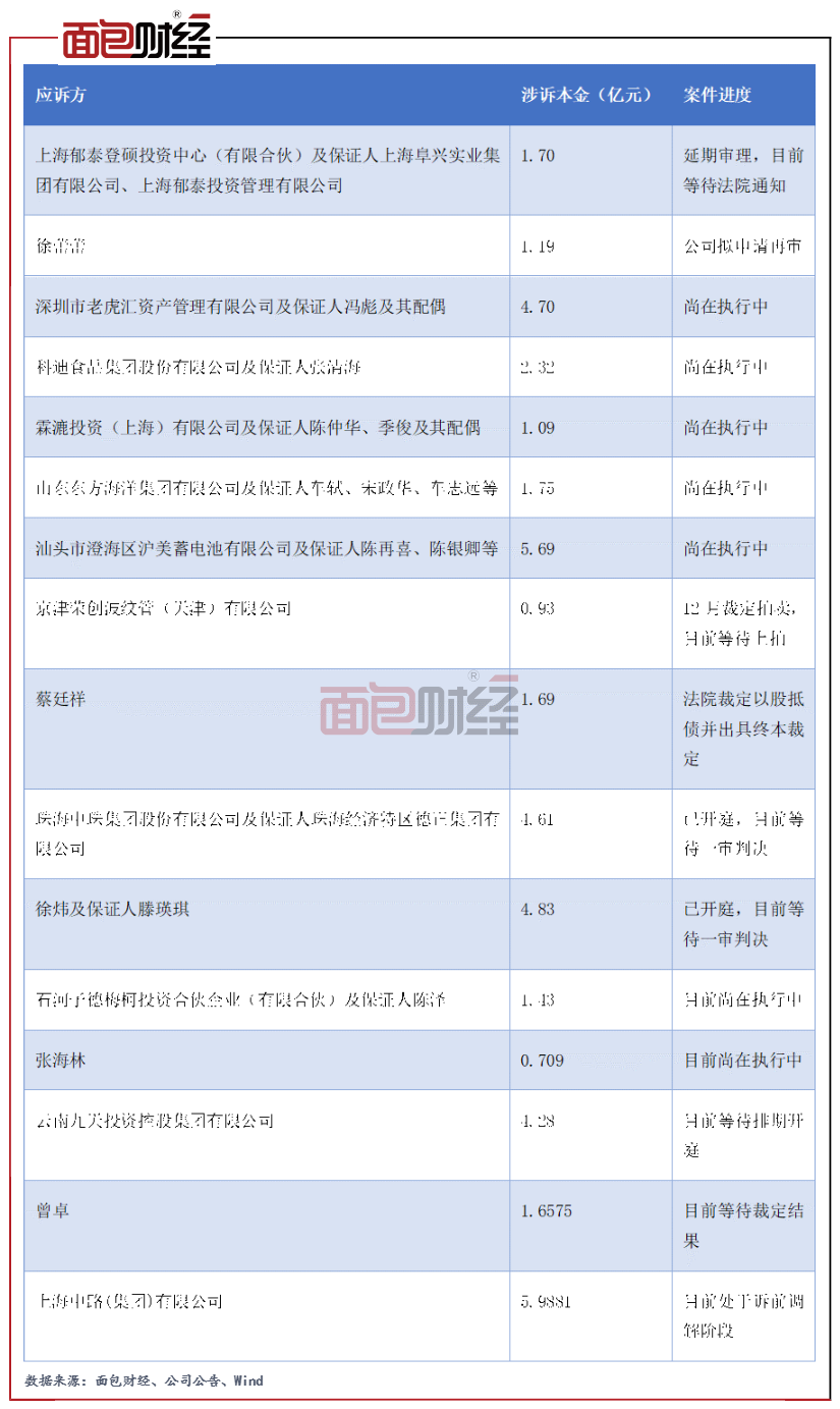 其中,公司與汕頭市澄海區滬美蓄電池有限公司、珠海中珠集團股份有限公司、徐煒和云南九天投資控股集團有限公司發生訴訟的本金金額均超過4億元,而對應質押式回購業務的標的股票分別為*ST猛獅、ST中珠、*ST騰信和*ST易見,均面臨一定交易風險。