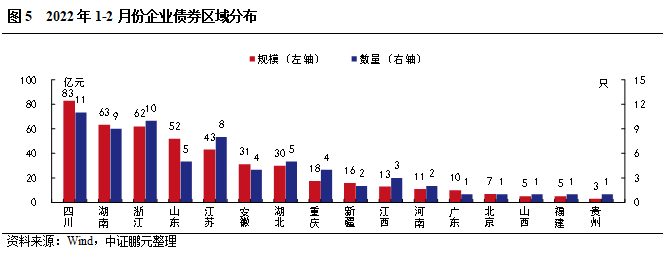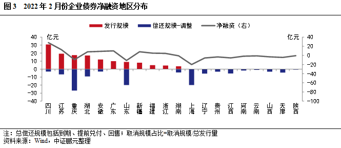 從地區(qū)分布看,2022年2月份多省企業(yè)債凈融資以?xún)魞斶€為主。具體看,四川實(shí)現(xiàn)凈發(fā)行28億元、遠(yuǎn)高于其他省份,其次是江蘇和廣東,凈融資規(guī)模分別為13億元和10億元。重慶因償還規(guī)模較大,當(dāng)月凈融資規(guī)模-9億元。此外,陜西、遼寧等9個(gè)省份本月未發(fā)行企業(yè)債,以?xún)斶€為主,其中上海償還規(guī)模最大,為20億元。