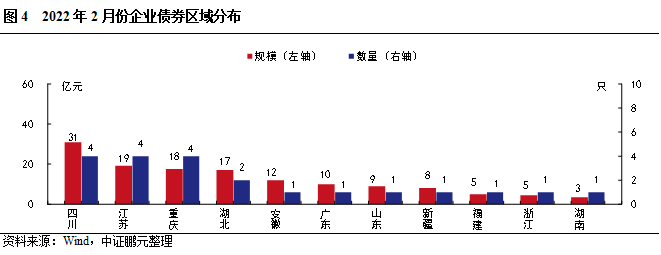2022年2月,共有11個(gè)省份發(fā)行了企業(yè)債券。其中,四川發(fā)行30.90億元,規(guī)模高于其他省份,其次,江蘇和重慶分別發(fā)行19.20和17.60億元。與上年同期相比,有7個(gè)省份發(fā)行規(guī)模出現(xiàn)增長(zhǎng),其中,江蘇、重慶和湖北,漲幅相對(duì)較大。有4個(gè)省份發(fā)行規(guī)模同比下降。