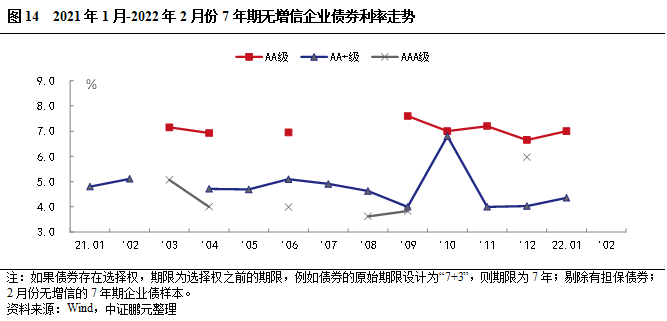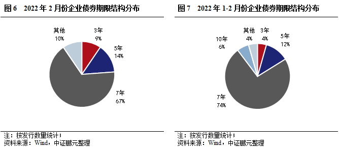 2022年2月,企業(yè)債券期限分布于7年期等期限品種。其中,7年期品種發(fā)行14只,占比67%,發(fā)行規(guī)模100.50億元,占比74%;5年期品種發(fā)行3只,占比14.3%,發(fā)行規(guī)模10.70億元,占比7.8%。與上月相比,5年期和7年期品種發(fā)行規(guī)模占比較上月分別下降3和上升9個(gè)百分點(diǎn)。綜合2022年1-2月看,7年期品種發(fā)行數(shù)量和規(guī)模分別為50只,303.80億元,占比分別為74%和67%。與上年同期相比,7年期品種規(guī)模占比上升10個(gè)百分點(diǎn)。