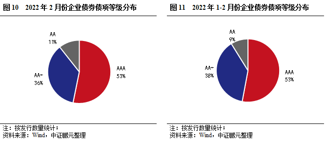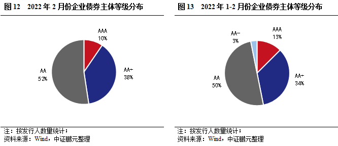 從發(fā)行主體等級(jí)看,2月AAA級(jí)主體2家,占比10%;AA+級(jí)主體8家,占比38%;AA級(jí)主體11家,占比52%,AA+及以上的高級(jí)別主體占比89%,較上月下降1個(gè)百分點(diǎn)。綜合2022年1-2月份看,AA+及以上的高級(jí)別主體占比46.9%,較上年同期上升1個(gè)百分點(diǎn)。