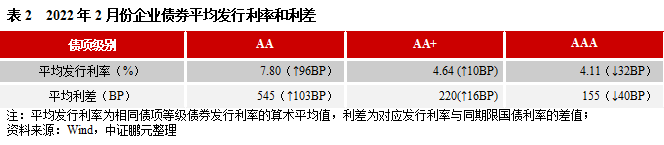 2022年2月,企業(yè)債券最高發(fā)行利率為7.80%,較上月下行20BP;最低發(fā)行利率為2.70%,較上月下行24BP。從債券級(jí)別來(lái)看,與上月相比,AA級(jí)和AA+級(jí)企業(yè)債平均發(fā)行利均上行,發(fā)行利差均擴(kuò)大,其中AA級(jí)利率上行96BP,利差擴(kuò)大103BP,幅度最大;AAA級(jí)企業(yè)債平均發(fā)行利率下行32BP,利差收窄40BP。