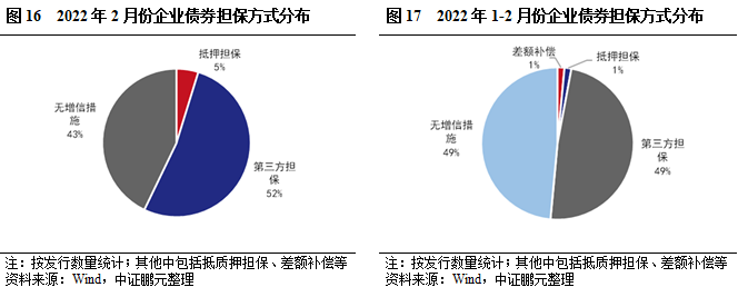 2022年2月,企業(yè)債有擔(dān)保的債券共計(jì)12只,數(shù)量占比57%,較上月上升8個(gè)百分點(diǎn),主要是AA+級(jí)主體增信比例上升,企業(yè)債增信比例持續(xù)上升。分主體級(jí)別看,AA級(jí)主體選擇增信發(fā)行的債券比重為82%,較上月上升9個(gè)百分點(diǎn);AA+級(jí)主體選擇增信發(fā)行的債券比重為25%,與上月持平。本月無(wú)AA-級(jí)主體發(fā)行。綜合2022年1-2月看,有擔(dān)保債券共計(jì)34只,數(shù)量占比51%,較上年同期上升4.8個(gè)百分點(diǎn)。