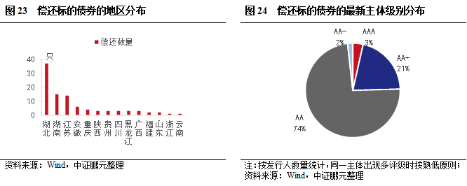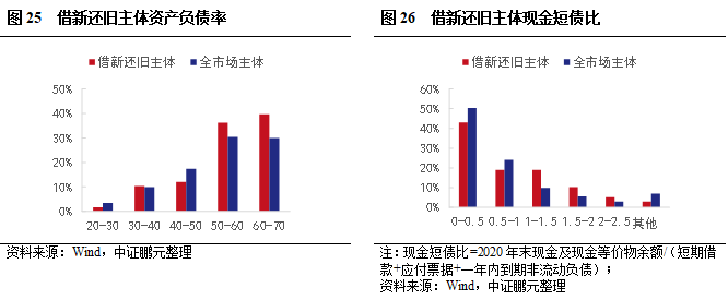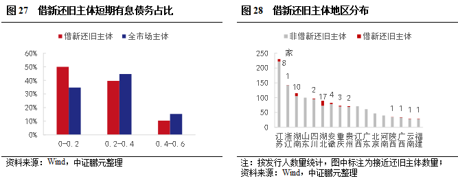和全市場(chǎng)企業(yè)債相比,借新還舊企業(yè)債主體資產(chǎn)負(fù)債率偏高,現(xiàn)金短債比和短期債務(wù)占比表現(xiàn)相對(duì)較好,但短期償債能力依然較弱。從地區(qū)看,存量主體較高的江浙地區(qū)借新還舊較少,湖北和湖南相對(duì)較多,借新還舊主體省內(nèi)占比分別為19%和9%。