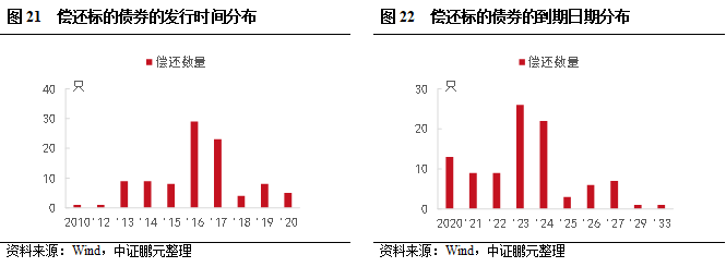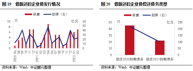 2022年2月,借新還舊企業(yè)債發(fā)行7只,規(guī)模23.37億元,位于單月高位。截至2022年2月,借新還舊企業(yè)債共發(fā)行67只,發(fā)行規(guī)模合計(jì)318.36億元。其中,2020-2022年分別發(fā)行121.39億元、161.60億元、35.37億元。從償還債務(wù)類(lèi)型看,償還2020年到期債券的有45只,發(fā)行規(guī)模218.19億元,償還2021年到期債券的有22只,發(fā)行規(guī)模100.17億元。結(jié)合發(fā)行與償還來(lái)看,存在一定時(shí)間差,與申報(bào)時(shí)間有一定關(guān)系,若債券發(fā)行時(shí),募集資金擬償還債券已用其他資金償還,則可以置換此部分資金。例如,2021年發(fā)行的借新還舊債券中,69.7%是用于償還2020年到期債券,2022年已發(fā)行的借新還舊債券均用于償還2021年到期債券本息。
