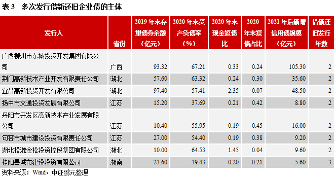在58個(gè)發(fā)行人,有8個(gè)發(fā)行人2022年第一次發(fā)行借新還舊企業(yè)債,有41個(gè)發(fā)行人2020年至2021年期間來(lái)發(fā)行過(guò)1只借新還舊債券,8個(gè)發(fā)行人在2020年至2022年期間發(fā)行2只及以上,另有1家因區(qū)域國(guó)企整合,暫未統(tǒng)計(jì)。其中,桂陽(yáng)縣城市建設(shè)投資有限公司連續(xù)3年發(fā)行借新還舊企業(yè)債,用于償還2只企業(yè)債相關(guān)到期本息。以2020年和2021年借新還舊主體為樣本分析后續(xù)再融資情況,48家借新還舊主體中有14家未新增債券,主要為2021年的企業(yè)債發(fā)行主體。在多次借新還舊主體中,廣西柳州市東城投資開(kāi)發(fā)集團(tuán)有限公司、荊門(mén)高新技術(shù)產(chǎn)業(yè)開(kāi)發(fā)有限責(zé)任公司和宜昌高新投資開(kāi)發(fā)有限公司,后續(xù)新增債券以銀行間產(chǎn)品為主,用于償還存續(xù)債券和其他有息債務(wù);桂陽(yáng)縣城市建設(shè)投資有限公司、揚(yáng)中市交通投資發(fā)展有限公司、湖北松滋金松投資控股集團(tuán)有限公司和丹陽(yáng)市開(kāi)發(fā)區(qū)高新技術(shù)產(chǎn)業(yè)發(fā)展有限公司,新增債券以企業(yè)債和私募債為主,用于償還存續(xù)債券和其他有息債務(wù)。