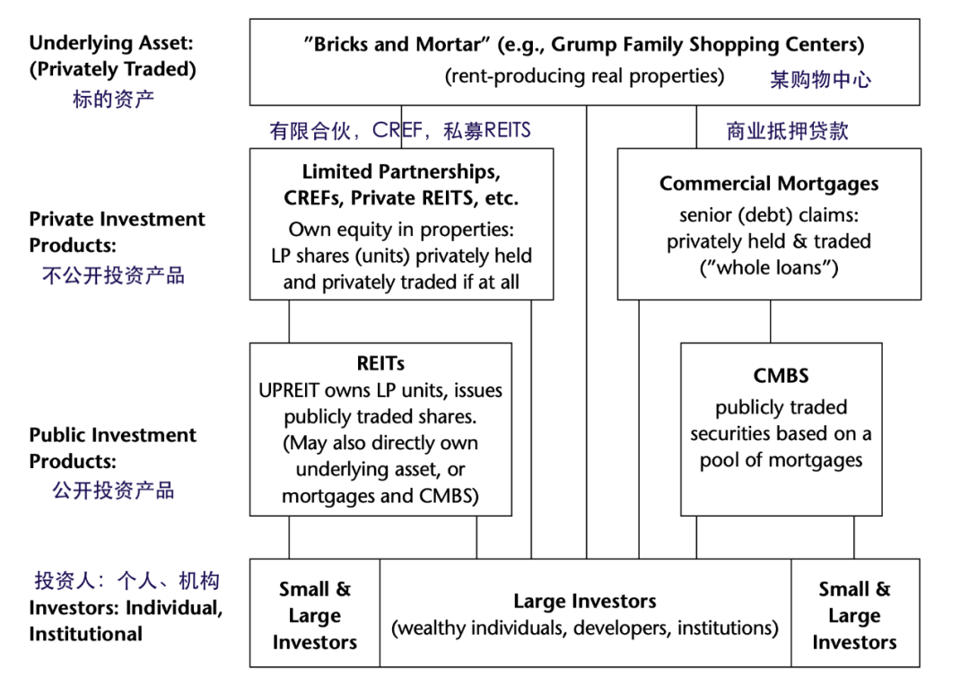 第二層的投資產品,則是在上面一層衍生出來的,可以公開市場交易的,REITs(房地產投資信托)和CMBS(商業抵押貸款支持證券)。