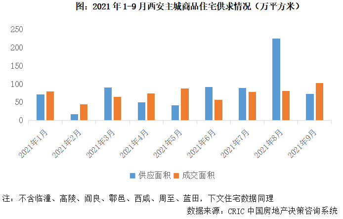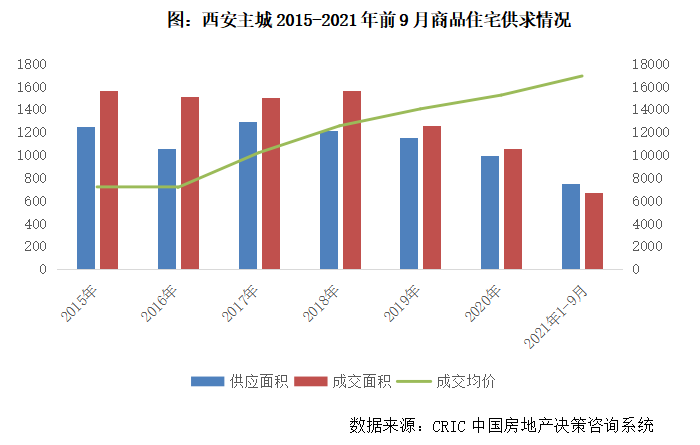 2021年以來(lái),在“330”、“830”兩次調(diào)控加碼之下,西安樓市總體保持平穩(wěn)運(yùn)行,受制于供應(yīng)縮量,成交相較往年有所回調(diào)。前9月,西安主城區(qū)商品住宅供應(yīng)面積752萬(wàn)平方米,同比微升5%,較2019年同期下降9%,成交面積674萬(wàn)平方米,同比下降9%,較2019年同期下降29%。