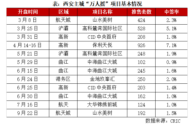 截至9月末,西安樓市出現(xiàn)12次“萬(wàn)人搖”,中海曲江大城獨(dú)攬三次,高科麓灣國(guó)際社區(qū)、CID中央首府、山水美樹均兩次上榜。人氣最高的當(dāng)屬航天城山水美樹項(xiàng)目,共計(jì)獲得2.3萬(wàn)組意向登記,超1.8萬(wàn)人核驗(yàn)通過參與搖號(hào),瓜分區(qū)區(qū)424套房源。5月29日開盤的中海曲江大城中簽難度最高,102套房源吸引近1.2萬(wàn)人搖號(hào),中簽率不足1%。