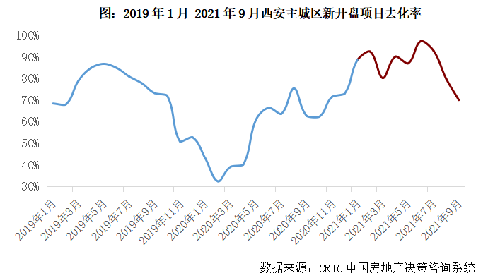 微觀層面,項(xiàng)目銷售表現(xiàn)仍然亮眼,去化率升至近三年來(lái)高位。前9月,西安主城區(qū)新開盤項(xiàng)目平均去化率高達(dá)88%,較2020、2019年同期分別增長(zhǎng)31個(gè)百分點(diǎn)和6個(gè)百分點(diǎn),2、6、7月等月份去化率皆在95%左右,意味著當(dāng)月新入市項(xiàng)目基本都實(shí)現(xiàn)開盤即罄。