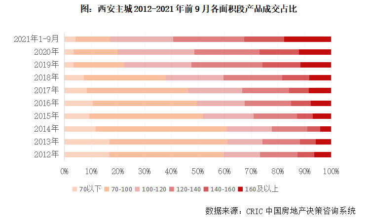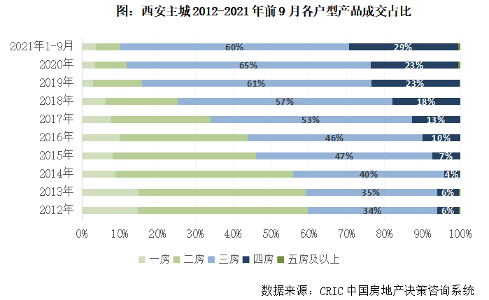 不難發(fā)現(xiàn),西安三房、四房產(chǎn)品成交占比逐年提升,并逐漸占據(jù)絕對(duì)主導(dǎo)地位。2015年,三房成交占比首度超過二房,2017年,三房成交占比突破50%,此后穩(wěn)步提升至六成以上。2016年,四房成交占比首次超過10%,到2021年前9月,比重已接近三成。反觀二房產(chǎn)品日漸邊緣化,成交占比由2015年的38%降至2021年的6%。