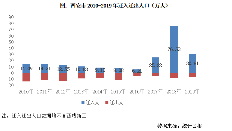 從遷出人口數(shù)據(jù)來(lái)看,2010-2015年,西安平均每年遷出10萬(wàn)人以上,而2016年-2019年,年均僅6萬(wàn)人遷出,遷出人口規(guī)模顯著下降直觀反映西安城市人口吸附力增強(qiáng)。