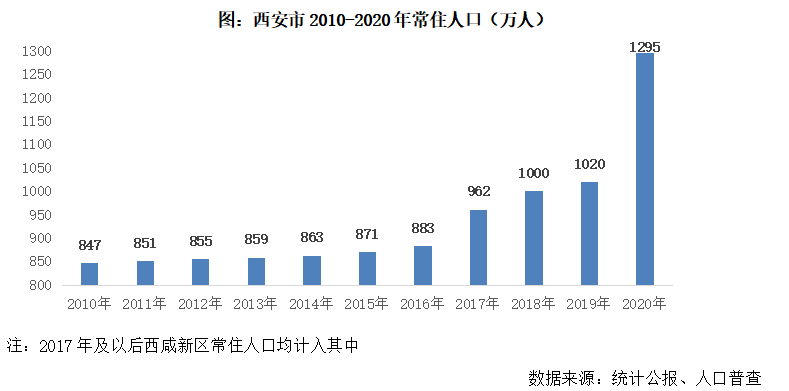 常住人口數(shù)據(jù)同樣可以印證這一結(jié)論,“七普”結(jié)果顯示,截至2020年,西安全市常住人口總量達(dá)到1295萬(wàn)人,較“六普”增加448萬(wàn),剔除西咸新區(qū)行政區(qū)劃調(diào)整對(duì)人口的影響,十年常住人口增量也超過300萬(wàn)人。結(jié)合統(tǒng)計(jì)年鑒公布的抽樣調(diào)查數(shù)據(jù)來(lái)看,常住人口流入主要集中在2017-2020年,前6年年均常住人口增量?jī)H在4萬(wàn)人左右。