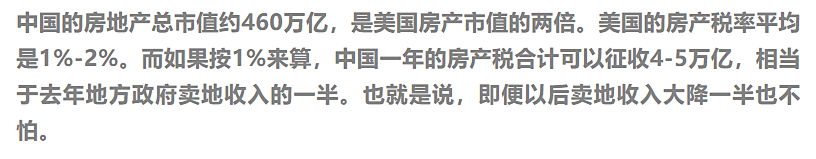 如果真的按這樣的說法,北上深,隨隨便便一套房子價值600萬,意味著大家隨隨便便要交6~12萬的房產(chǎn)稅!