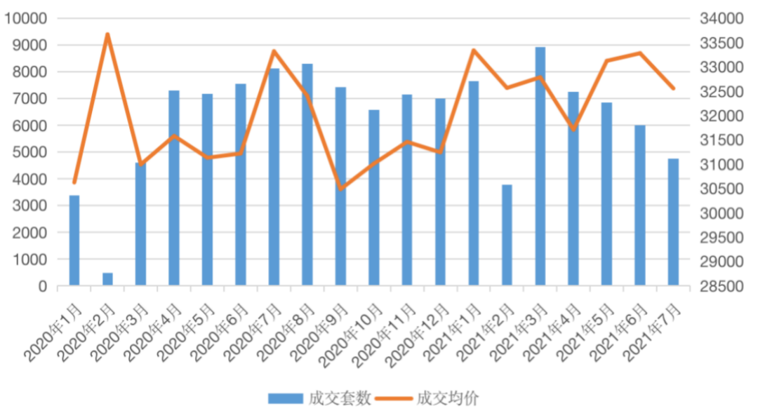 圖:2021年1月-2021年7月杭州二手住宅成交量價(jià)(單位:套、元/平方米)