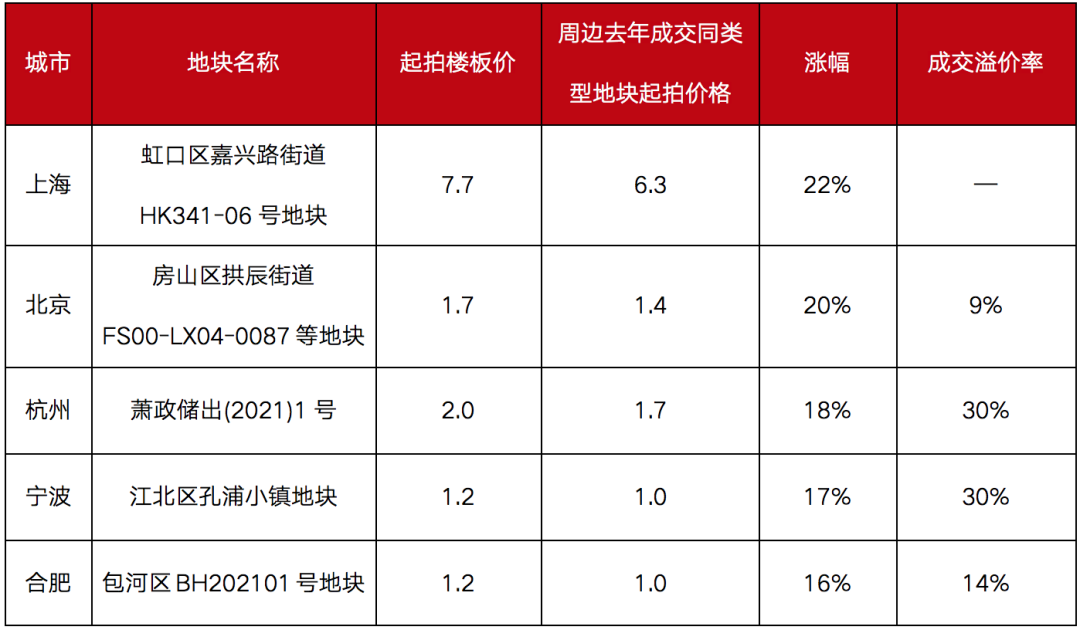 注:虹口嘉興路街道地塊暫未成交,表中其余四宗地均為上限價成交地塊。