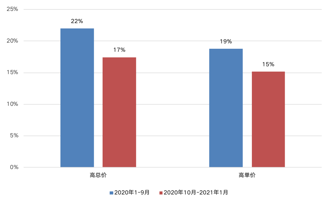 減緩熱點區域優質地塊入市,增加郊區、新城等區域土地或保障房用地供應,優化整體土地供應結構。從高價地成交占比能夠直觀看出熱點城市在2020年10月后在土地供應方面的調整。對比2020年10月前后成交高總價和高單價地塊占比來看,2020年10月至2021年1月前四周期間成交總價超過10億元的住宅用地比例僅有17%,較2020年前9月下降了5個百分點,高單價地塊的成交占比同樣也在下滑,2020年10月后成交占比僅有15%,也較此前減少了4個百分點。
