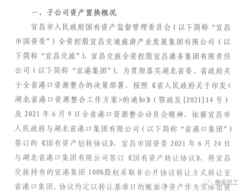 2、根據(jù)宜昌交通旅游產(chǎn)業(yè)發(fā)展集團有限公司2021年8月18日發(fā)布的公告,擬將全資控股的異常港務(wù)集團有限責(zé)任公司的股權(quán)以非公開協(xié)議轉(zhuǎn)讓的方式劃轉(zhuǎn)至湖北省港口集團有限責(zé)任公司,同時置換成對宜昌市建設(shè)投資控股集團有限公司的持股。公司的控股股東和實際控制人均是宜昌市國資委。公司的主體信用評級為AA,存續(xù)債券3只,存續(xù)債券金額為13億元。