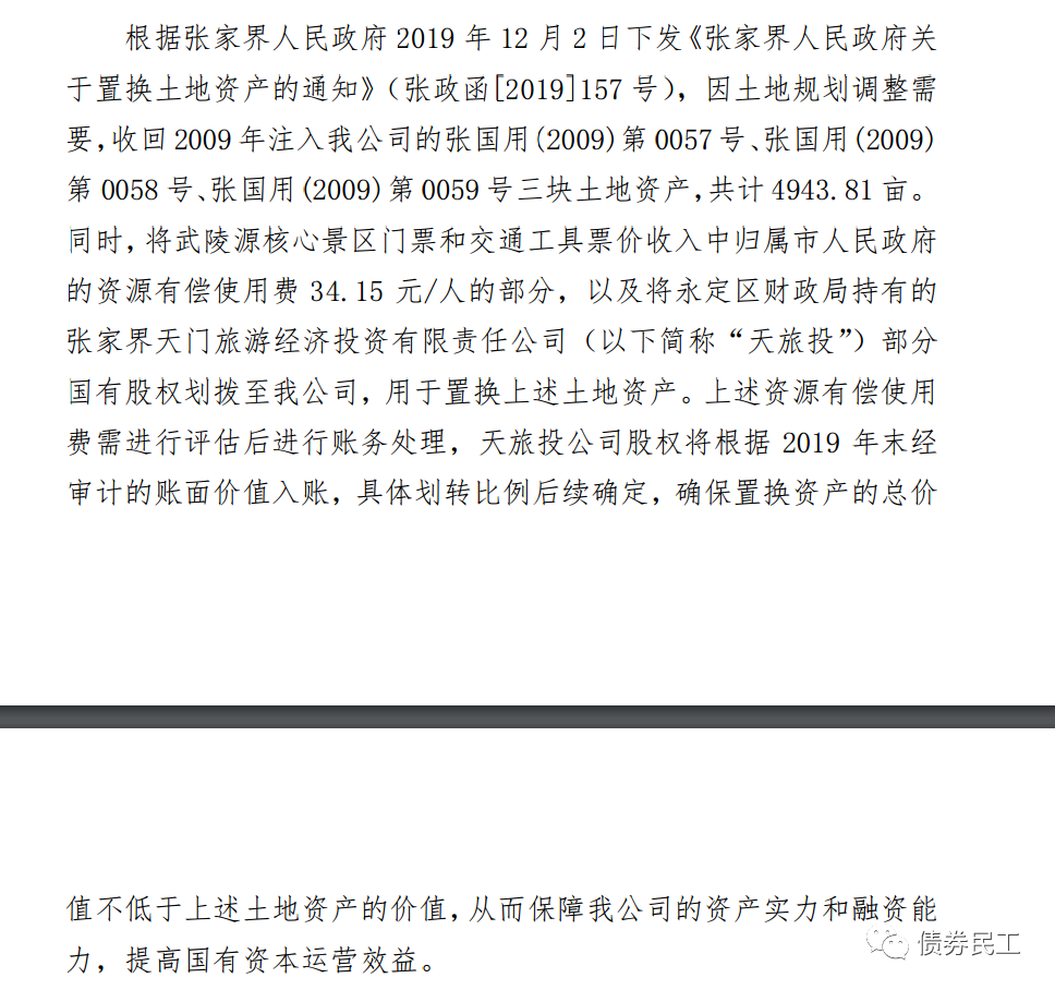 4、根據(jù)張家界市經(jīng)濟發(fā)展投資集團有限公司于2020年6月9日發(fā)布的公告,將部分門票和交通工具收入、國有企業(yè)股權(quán)劃入公司,同時將三塊土地資產(chǎn)劃出,實現(xiàn)國有企業(yè)資產(chǎn)置換。公司的控股股東是和實際控制人是張家界市國資委。公司的主體信用評級為AA(中證鵬元和聯(lián)合資信),存續(xù)債券8只,存續(xù)債券金額為69.10億元。