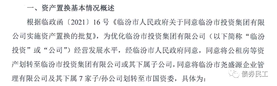 3、根據(jù)臨汾市投資集團有限公司2021年6月4日發(fā)布的公告,通過了持有人會議決議,擬將臨汾市的公租房等資產(chǎn)用于置換公司的 臨汾市堯盛源企業(yè)管理有限公司及其下屬7家子/孫公司等劃轉(zhuǎn)至臨汾市國資委。公司的控股股東是和實際控制人是臨汾市國資委。公司的主體信用評級為AA+,存續(xù)債券9只,存續(xù)債券金額為73億元。