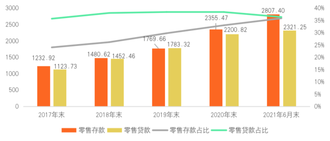 圖 4:徽商銀行2017-2021年零售存款與零售貸款情況(單位:億元,%)