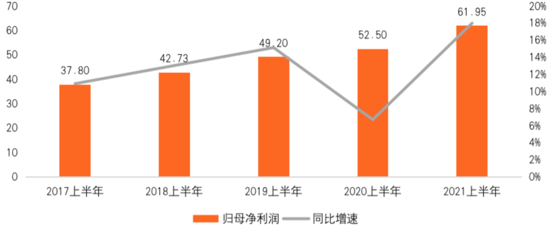 圖 2:徽商銀行2017上半年-2021上半年歸母凈利潤情況(單位:億元,%)