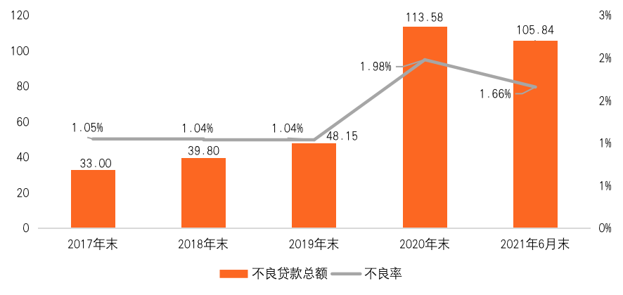 圖 3:徽商銀行2017-2021年不良貸款情況(單位:億元,%)