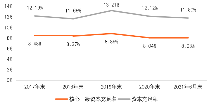 8月上旬,銀保監會發布的銀行業保險業主要監管指標數據顯示,2021年二季度末,商業銀行核心一級資本充足率為10.50%,資本充足率為14.48%。相比之下,徽商銀行2021年6月末的核心一級資本充足率8.03%,資本充足率11.80%,分別較2020年末下降0.32個百分點和0.01個百分點。這一表現不僅遠低于行業平均水平,從近5年總體變化趨勢來看,還在逐漸逼近監管的紅線。