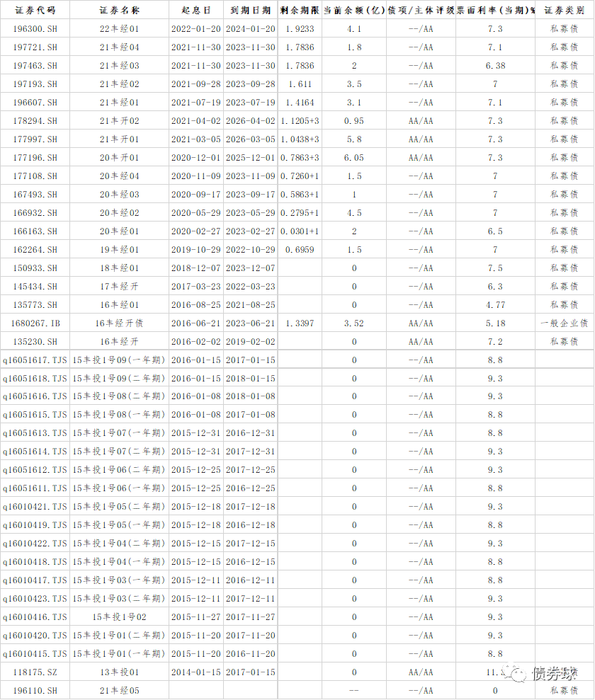 豐縣經(jīng)開累計(jì)發(fā)行37只債券(產(chǎn)品),其中交易所非公開公司債19只、企業(yè)債1只、天交所產(chǎn)品17只。這里的天交所產(chǎn)品名稱為私募債券,對(duì)于這樣的稱呼,筆者以為值得商榷,因此就用產(chǎn)品進(jìn)行了替代。目前,風(fēng)險(xiǎn)經(jīng)開存續(xù)的債券有14只,1只企業(yè)債和13只非公開公司債。