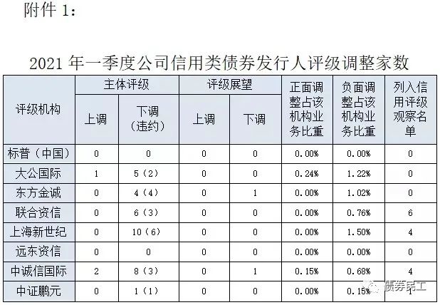 根據(jù)中國證券業(yè)協(xié)會和中國銀行間市場交易商協(xié)會于2021年6月 2日公布的《2021年第一季度債券市場信用評級機(jī)構(gòu)業(yè)務(wù)運(yùn)行及合規(guī)情況通報(bào)》,整個一季度主體信用評級正面調(diào)整的只有3家,同比減少78.57%!其中大公國際上調(diào)1家,中誠信國際上調(diào)2家,其他評級公司均無上調(diào)記錄,主體信用評級提升的難度真的不是一般的大了!