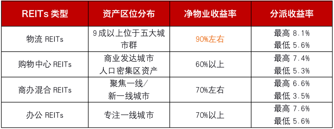 綜上可以發現,物流REITs的資產要求最高但其分派收益率也是最高的,達5.6%-8.1%,購物中心REITs次之,為5.3%-7.4%,最低的是商辦混合REITs,約3.5%-6.6%。