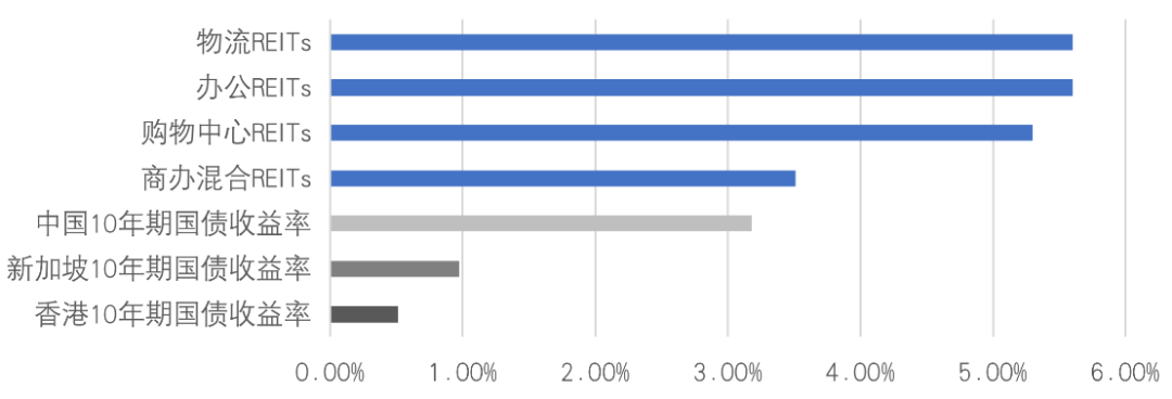 對于投資者來說,相較于投資國債等固定收益產品獲得的收益,REITs不失為一種選擇,除去REITs漲跌帶來的交易收益,持有REITs獲得的分派收益仍遠高于投資本地十年期國債獲得的收益。