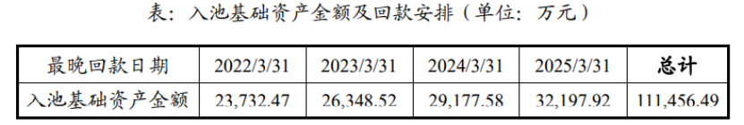 本次擬入池基礎資產為重慶茂和根據《巴南區龍洲灣隧道項目PPP合同》約定,所享有的巴南區龍洲灣隧道項PPP項目2021-2024年度應收影子通行費及其從屬權利,發起機構根據《信托合同》將該等資產信托/轉讓予受托人。未來4年預計回款現金流為111,456.49萬元。