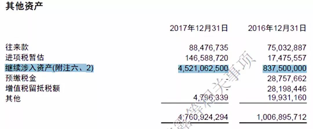 商誠小貸對繼續涉入資產和負債的表述如下:“截至2017年12月31日,本集團因繼續涉入確認的資產的賬面價值為人民幣4,521,062,500元(2016年12月31日:人民幣837,500,000元),與之相關的負債為人民幣4,521,062,500 元(2016 年12 月31 日:人民幣837,500,000元),分別計入繼續涉入資產和繼續涉入負債,該等負債金額表示本集團因持有次級檔計劃,收益分配處于次級而導致可能不能收回的最大現金流?!?/p>