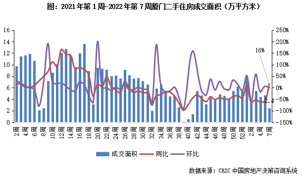 2022年第7周,廈門二手住房成交面積同比由跌轉增至16%,成交規模收2.4萬平方米。本周市場成交量雖回落但同比由跌轉增,短期內或快速回升。