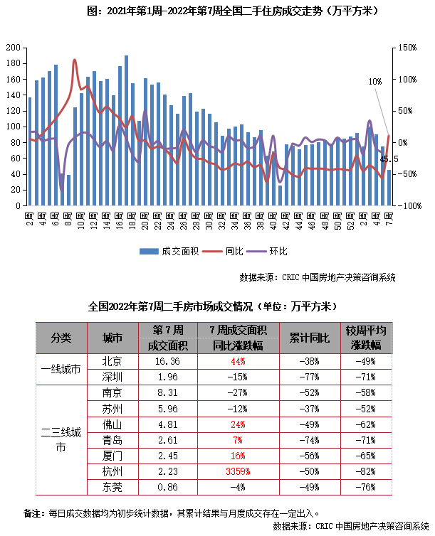 22022年第7周,北京二手房成交面積為16.4萬平方米,較去年同期由跌轉增至44%。本周北京二手房市場成交較節前仍有一定距離,預計短期內市場規模仍在低位后續或有回升。