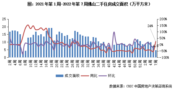 2022年第7周,佛山二手住房成交面積同比收漲24%,成交體量收4.8萬平方米。本周市場成交規?;卣{但較之去年同期仍有較大漲幅,短期內規模或快速回升至節前水平。