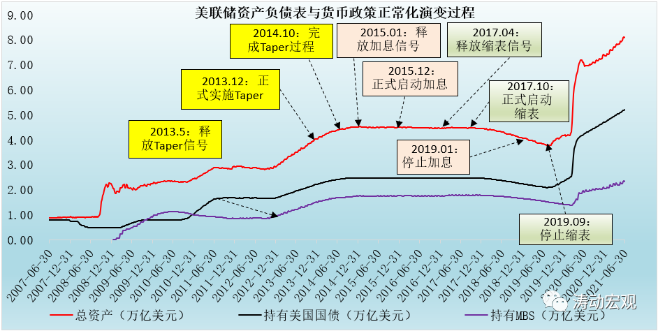 前面已經(jīng)指出,美聯(lián)儲(chǔ)的貨幣政策正常化路徑基本上遵循“向市場釋放Taper信號(hào)——Taper過程——向市場釋放加息信號(hào)——加息——向市場釋放縮表信號(hào)——正式縮表”的邏輯脈絡(luò)。