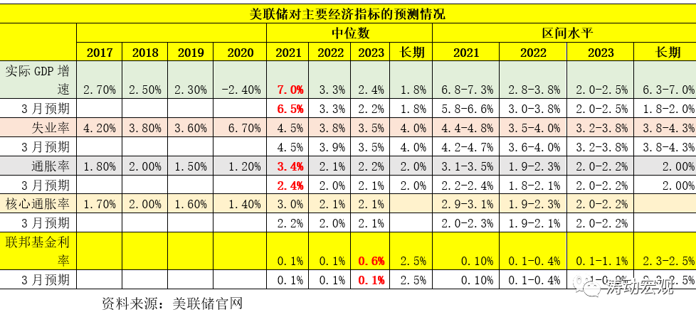 雖然仍繼續(xù)維持1.80%的經(jīng)濟(jì)增速(中位數(shù))、4%的失業(yè)率(中位數(shù))、2%的通脹率(中位數(shù)),但卻大幅上調(diào)了2021年的經(jīng)濟(jì)增速和通脹預(yù)期。