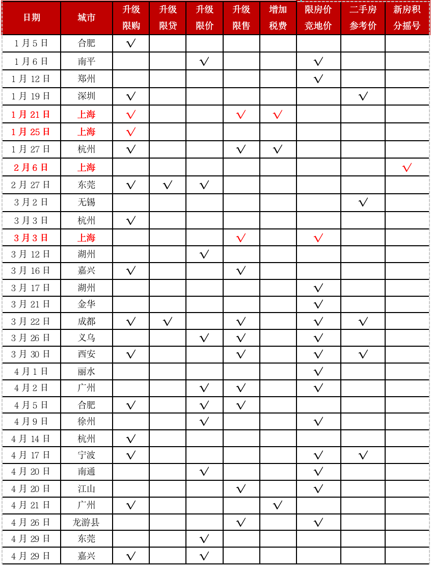 為落實(shí)穩(wěn)地價(jià)、穩(wěn)房?jī)r(jià)、穩(wěn)預(yù)期目標(biāo),合肥、深圳、東莞、成都等近30城相繼升級(jí)調(diào)控,并“下沉”到衢州下轄的江山市、龍游縣這類熱點(diǎn)縣市,重點(diǎn)涉及升級(jí)限購(gòu)、升級(jí)限貸、升級(jí)限價(jià)、升級(jí)限售、增加房地產(chǎn)交易稅費(fèi)、設(shè)立二手房參考價(jià)格、新房積分搖號(hào)等內(nèi)容。其中,上海連番6次政策加碼,嚴(yán)堵政策監(jiān)管漏洞,堪稱本輪房地產(chǎn)調(diào)控的風(fēng)向標(biāo)。
