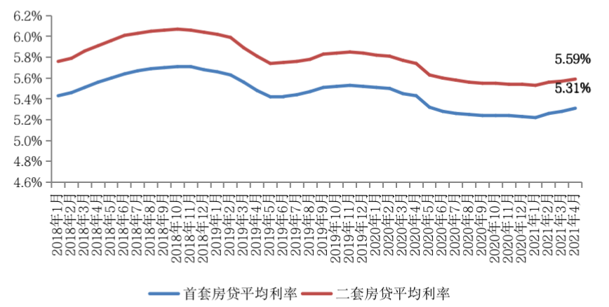 圖:2018年1月-2021年4月全國(guó)首套、二套房貸平均利率